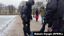 Обновление в 15:39. Как уточнило "МБХ медиа", на Невском проспекте позднее задержали активиста Андрея Макашова без плаката. Он был участником пикетов на Сенатской площади.