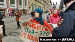 В Петербурге активистки движения "Восьмая инициативная группа" устроили на Невском проспекте одиночные пикеты за права женщин, сообщает корреспондент сайта Север.Реалии. В пикетной очереди стоят около 100 человек. Девушки пришли с плакатами "Любить себя – это революция", "Насилие – не семейная ценность", "Свободу женщинам-политзаключенным".