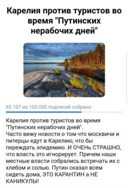 Житель карельского города Сортавала Эдуард Колобов разместил во "ВКонтакте" петицию под заголовком "Карелия против туристов во время "Путинских нерабочих дней". Текст петиции – в четырех предложениях: