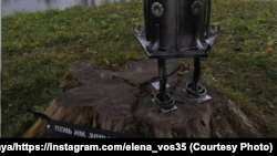 Неизвестные поставили на старый пень серебристую урну и прикрепили табличку: "Пень им. Э. Памфиловой".