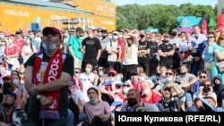 Многие из пришедших посмотреть футбол в фанзоне были без защитных масок или "носили" их на подбородке, хотя о коронавирусе и масках постоянно говорили волонтеры через громкоговорители.