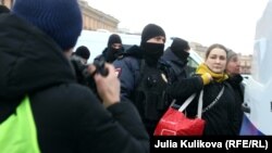Позднее в Петербурге на Сенной площади задержали пикетчицу Ануш Панину. На ее груди был плакат с надписью "Зачем есть, если можно читать новости", а на спине она наклеила листки с женскими именами, под которыми был текст: "Кира никогда больше не увидит папу", "Наташа думает, что брат поехал на учения", "Маша ждет сына домой".
